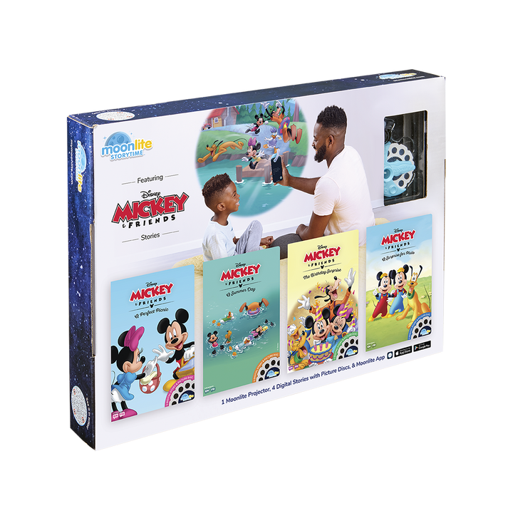 Moonlite Storytime transforms together time into a special experience for parents, caregivers, and children. The 4-Story Starter Pack with Projector uses ambient music, playful sounds, and big, bright storybook images to tickle your child’s senses. Moonlite Storytime creates a magical and unique bonding experience that children love and parents look forward to.